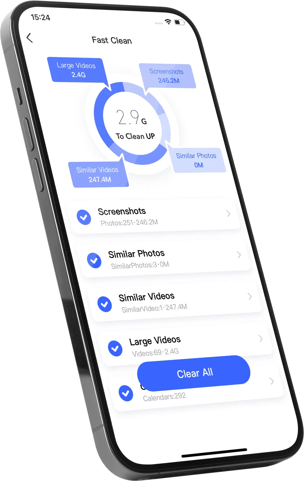 Too many similar photos and videos clogging up your device? Delete them in a few taps with Powerful Cleaner! Large photos & videos use too much space? Just compress them to a smaller size.